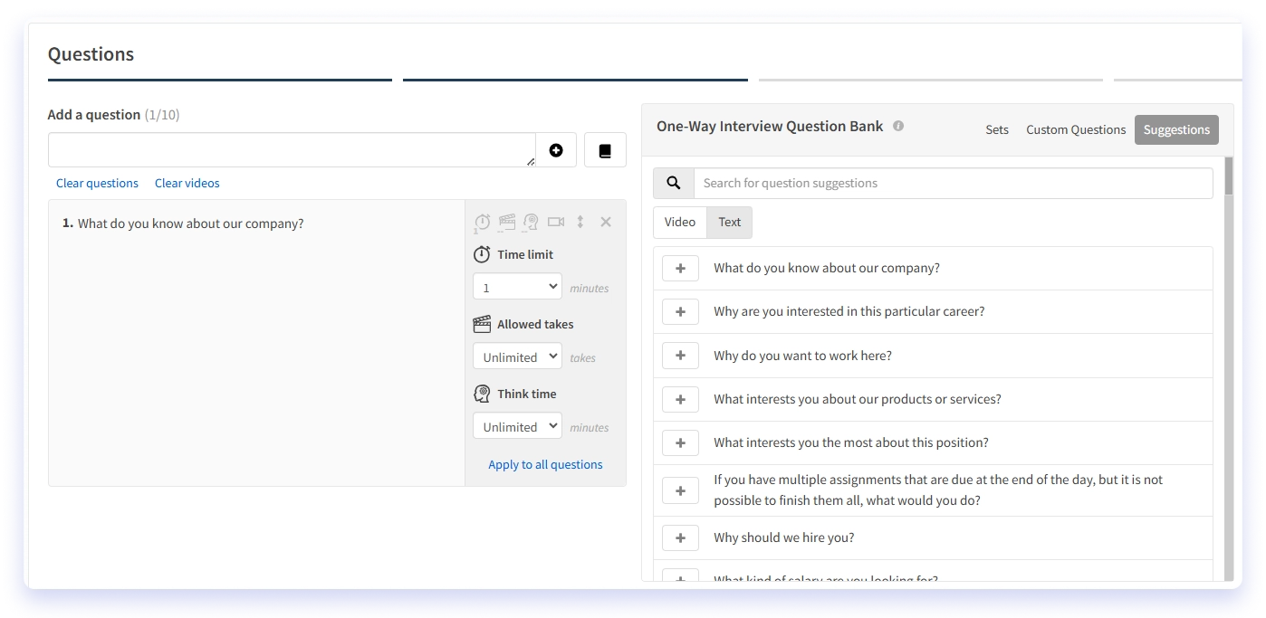 You build from a central question library you create yourself or pull from their bank, then add behavioral profile assessments with multiple-choice components. Configuration happens fast; many teams launch their first interview the same day.