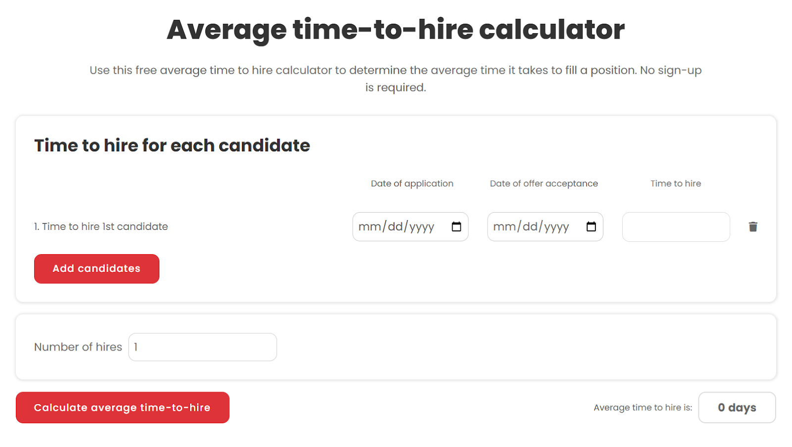 Basic calculation: Count calendar days from job posting to offer acceptance. Add up the days for all hires, then divide by the number of hires for your average.